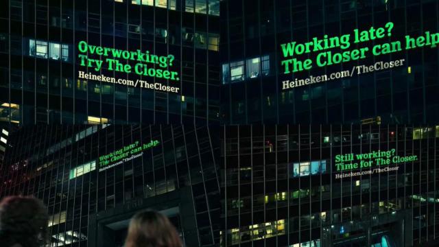 建筑广告不再局限于大屏幕展示。喜力通过投影仪在加班办公楼外墙投放“下班后喝一杯”的广告,巧妙地绕过传统广告栏。只需要一台投影仪,就可以低成本实现高接触,突破了建筑媒体广告大屏幕的固有想象力。