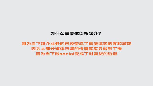 今天,我想和大家分享一下对创新媒体的理解和实践。这个主题对我来说很特别,因为我们是 agency 从一个角度来看,营销不再像以前那样简单地拍摄广告或制作图片,而是试图帮助品牌从整个环节的角度实现营销目标。