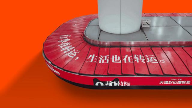 在机场,天猫用输送带做广告,用“春暖花开,转运”的谐音,当人们在机场“转运”行李时,生活也在“转运”。