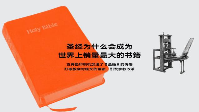 基督教已经成为世界上最大的宗教。除了耶稣,最大的英雄是古腾堡——西方活字印刷的发明者。西方第一台打印机之后,第一部打印作品就是《圣经》。从此,传教士不用亲自讲复杂的故事,只需要给大家一本打印好的书,就可以传播信念。
