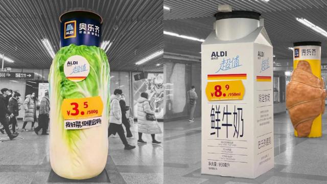 奥乐齐将地铁柱包装成卷心菜、牛奶、面包等商品形象,突破了“地铁广告仅限广告牌”的认知,体现了媒体创新通常源于对常规形式的重新思考,很多创新只受到想象的限制。