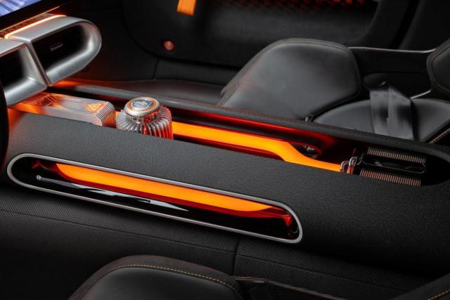 梅赛德斯在内饰设计方面 -AMG GT XX 概念车也不令人失望。简单驾驶舱的设计理念使得中控台、门扶手等部位采用了暴露的白色车身结构设计,并点缀了代表高压电的橙色灯管,凸显了高性能纯电动跑车的非凡魅力。