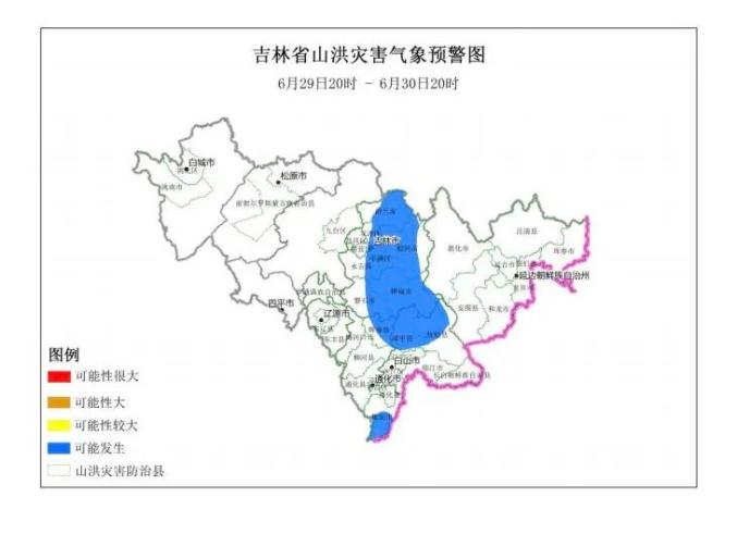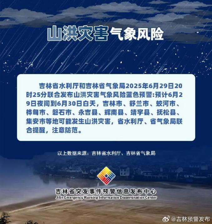 2025年6月29日20时25分,吉林省水利厅和吉林省气象局联合发布山洪灾害气候风险蓝色预警:预计吉林市、舒兰市、蛟河市、桦甸市、磐石市、永吉县、辉南县、靖宇县、抚松县、集安市等地可能发生山洪灾害,省水利厅、省气象局联合提醒,注意预防。