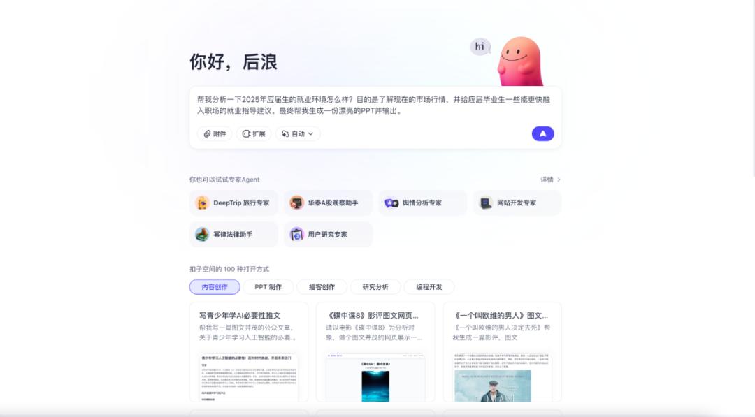 “哪里需要哪里搬”的扣子空间,不光能解决让你眼前一黑的痛点,还能给你提供保姆级的思考路径,以及直击人心的深度交流。它已经超过了“工具人”的范畴,进化成了能教你做事儿的24小时全能mentor,专治各种职场上的“不想干”、“不会干”、“干不好”以及“好无聊”。