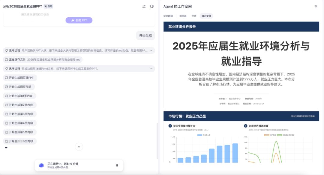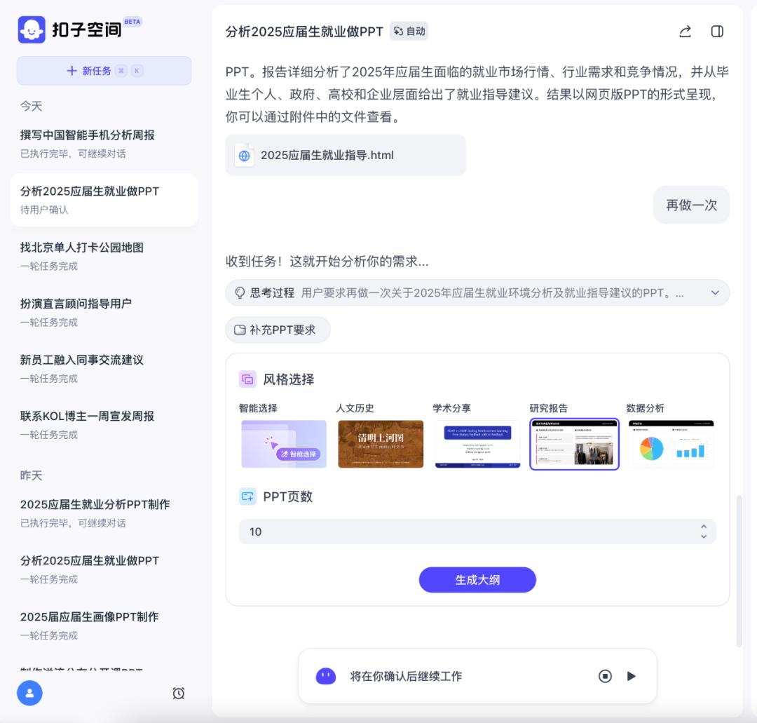输入“分析一下2025年应届生就业环境怎么样”的需求后,扣子就会开始思考自己的执行计划,你只需要点击两次“生成大纲”与“生成PPT”的选项,扣子空间就会默默做好它该干的事情。