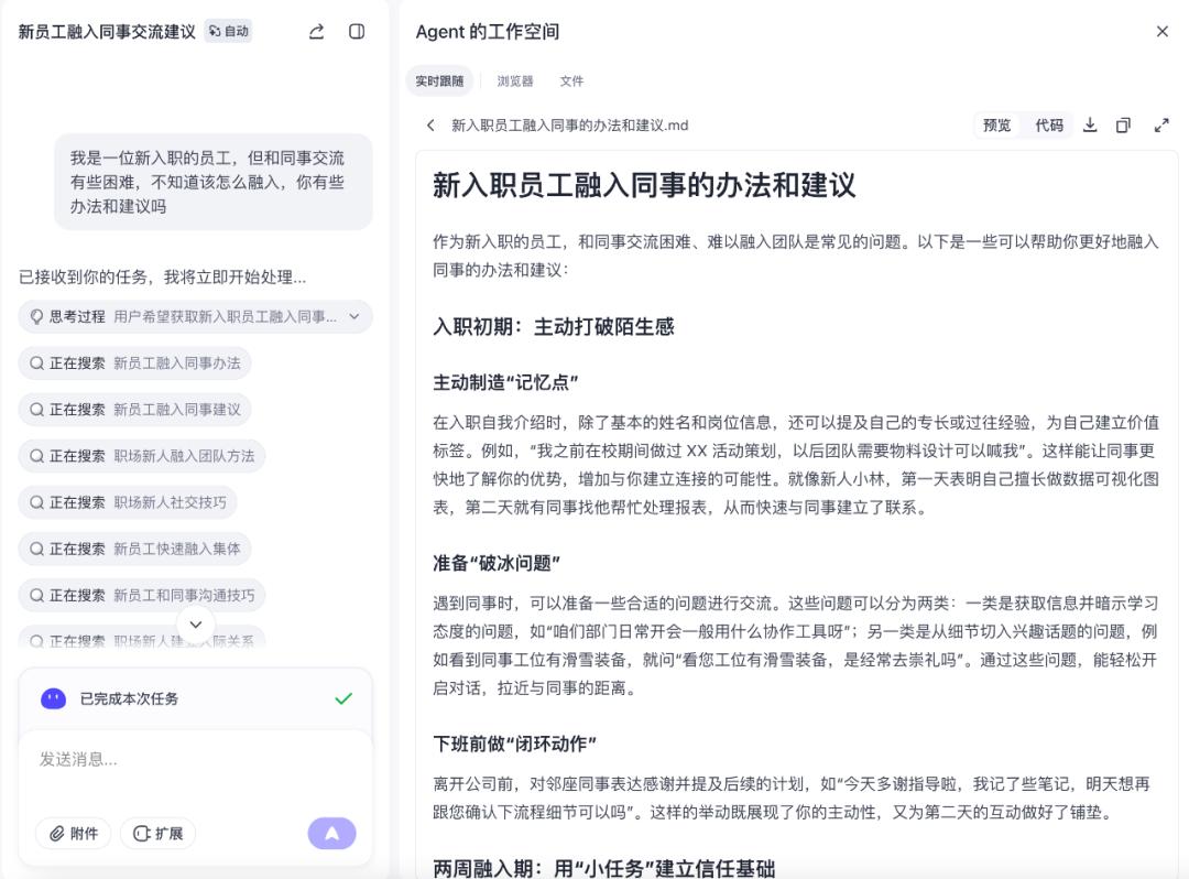 另一边,还在为了职场人际关系而苦恼的松鑫,也决定再次求助扣子空间这个24小时在线的“狗头军师”。从入职初期怎么打破陌生感,到融入期该如何和同事进一步社交,扣子都给松鑫提供了可以快速融入职场的好法子。“有了它,妈妈再也不用担心我的职场人际交往了!”