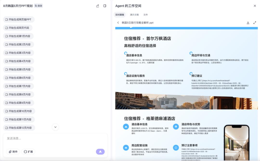 一系列操作下来,可以说,扣子空间把我的PPT恐惧症给治好了。既能从0到100生成一份详尽的调研报告,同时还审美在线,告别了预制菜审美,没有了浓厚的AI味。甚至专业度也是杠杠的——无论是应届生焦虑,还是专业地理知识,甚至是首尔暴走攻略,全都不在话下。