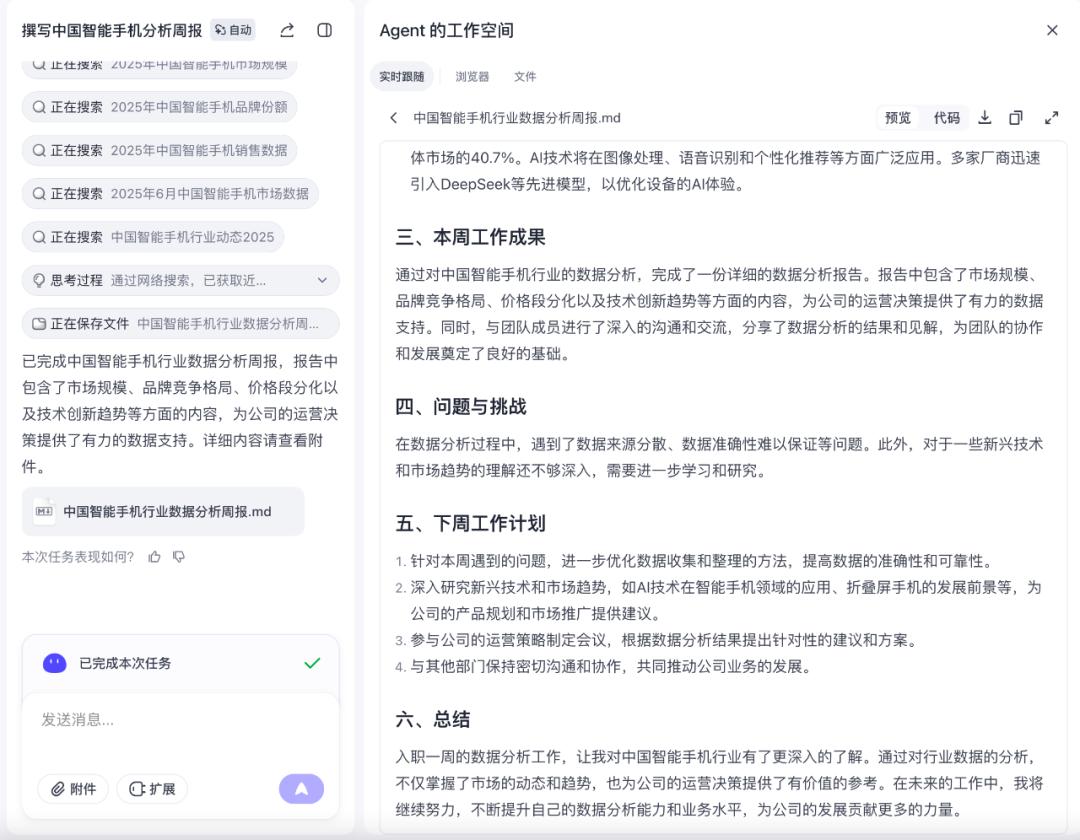 她又一次打开扣子空间,把自己的流水账一股脑丢给扣子空间。没有几分钟,扣子空间就秒变职场老油条,给松鑫整理出了本周的“丰功伟绩”,下周的“宏伟蓝图”,以及“深刻反思”。松鑫只需要在这个基础上填几个关键数字,就能轻松get一款让领导印象深刻的超长周报了。