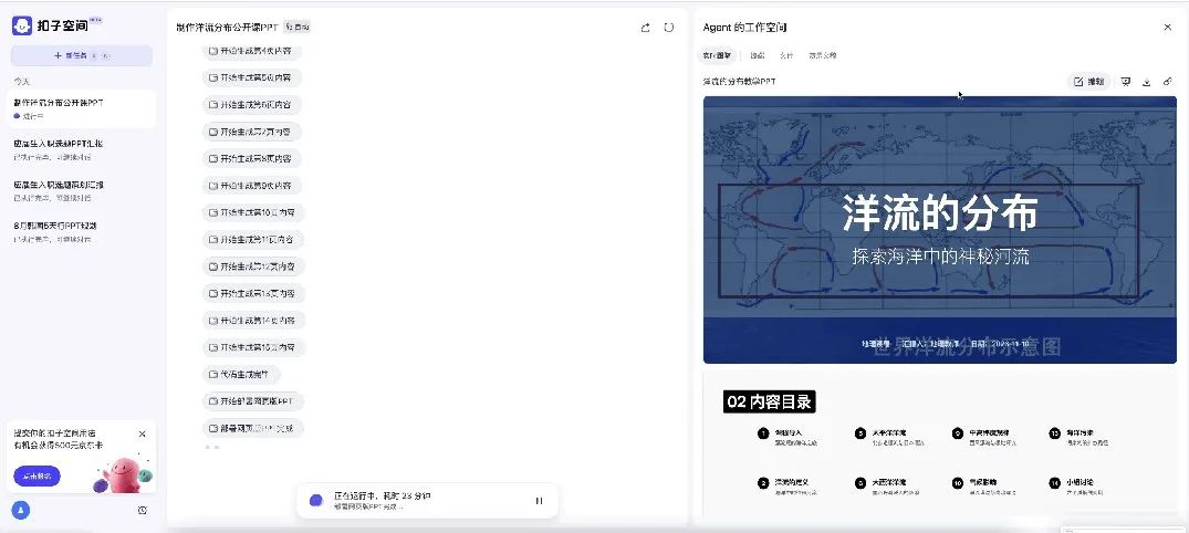 我把小李的公开课需求发给扣子,扣子的表现还是非常稳定,既能自行上网搜索洋流的相关图片,还能结合知识点进行搭配,排版也赏心悦目,三下五除二就生成了一套公开课课件。要是我上学的时候,老师能做出一个如此干净整洁的PPT,说不定我的高考地理成绩还能再提高10分……