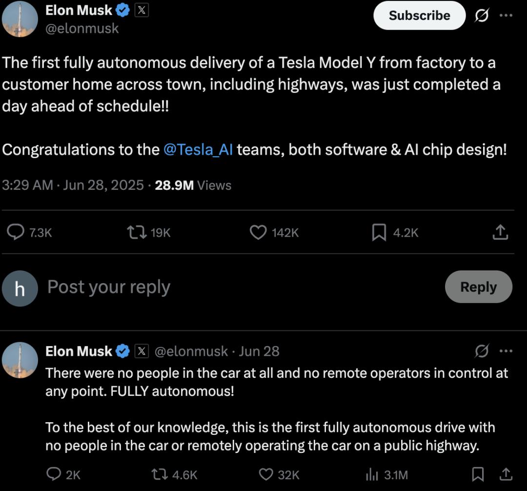 马斯克先是郑重其事发了一条推文,宣称特斯拉完成了“史上第一次”完全自动驾驶的车辆交付。