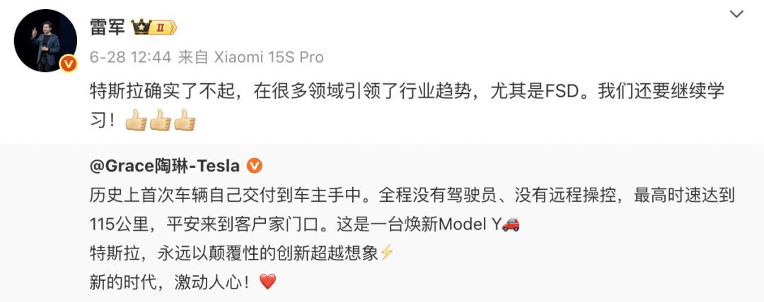 雷总在微博上转发了特斯拉官方的帖子,并且表示“特斯拉了不起,小米还要学习”: