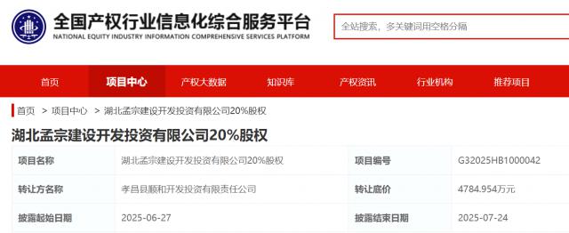 乐居财经 王敏 6 月 27 日,据全国产权交易中心介绍,湖北孟宗建设开发投资有限公司 20% 股份挂牌转让,转让底价为 4784.95 元,出让方为孝昌县顺和开发投资有限公司,披露结束日期为 2025-07-24。