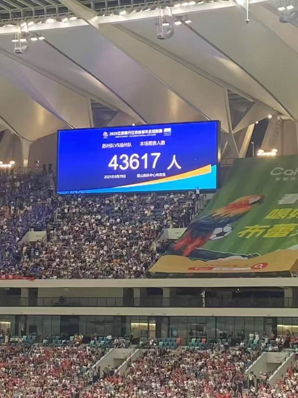 六月二十九日,苏超第五轮苏州vs扬州队比赛在昆山奥体中心举行。据现场官方广播显示,本场比赛有43617名观众进入。