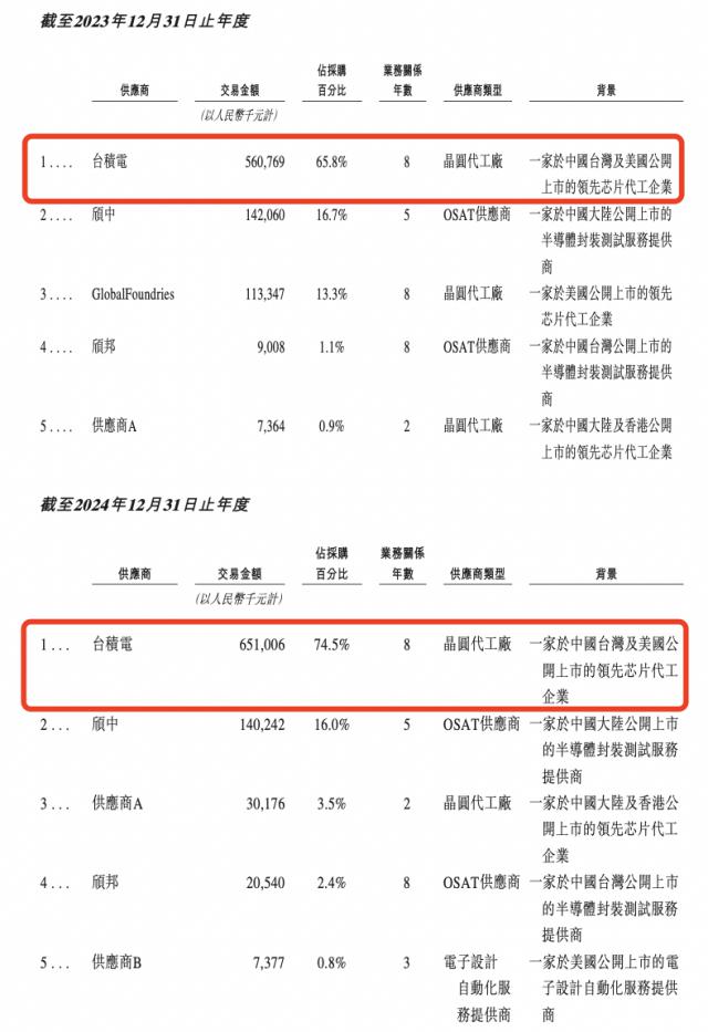 报告期内,公司从五大供应商的采购金额分别为 5.45 亿元、8.33 亿元及 8.49 亿元,占各期间采购总额的1亿元。 96.9%、97.8% 及 97.2%。在这些供应商中,台积电一直是最大的。