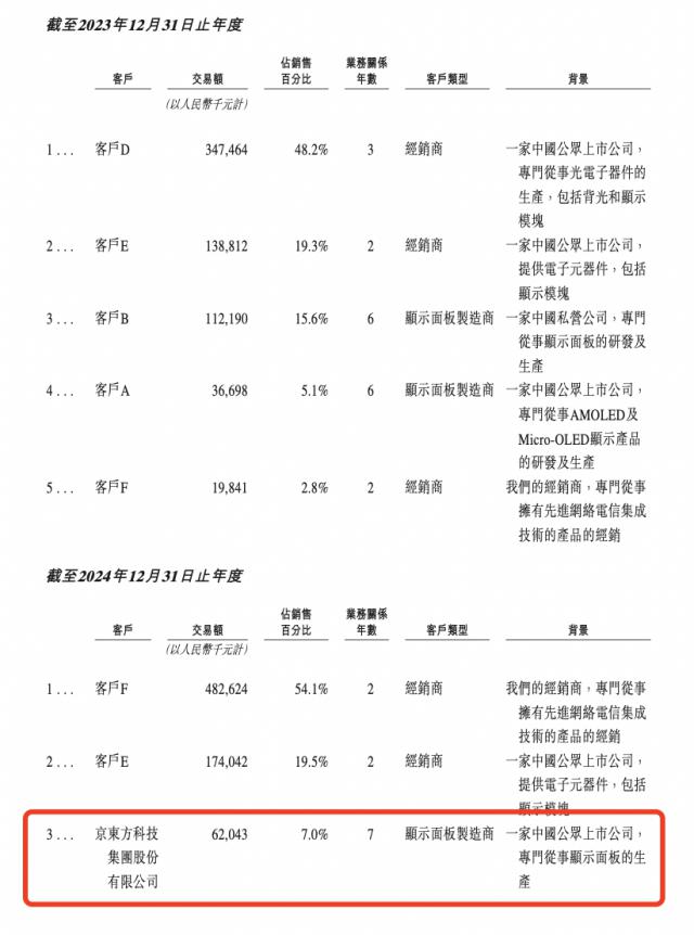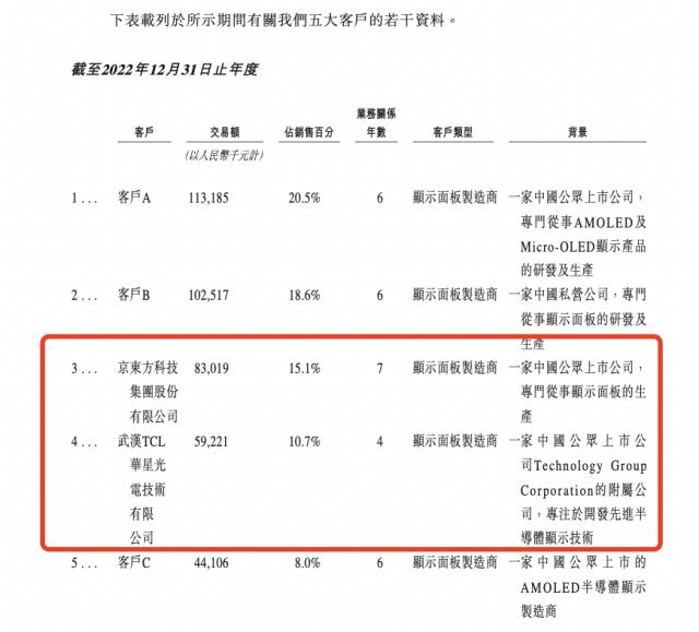 值得注意的是,在报告期内,公司对五大客户的销售额分别是 4.02 亿元、6.55 亿元及 8.04 亿元,分别占各期销售总额的1亿元。 72.9%、91.0% 及 2022,90.2%。 年京东方、TCL 2024年,华星光电分别是第三、第四大客户, 年京东方是第三大客户。