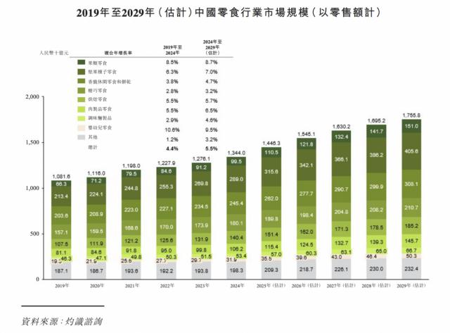 2019 2008年,中国零食行业市场规模为人民币。 10,816 亿元,于 2024 每年增加到人民币 13,440 在此期间,复合年增长率为亿元。 4.4%。在零食和包装食品不断创新、对更健康食品的需求不断增加、渠道整合等因素的推动下,中国零食市场有望 2029 每年增加到人民币 17,558 亿元,2024 年到 2029 年度复合年增长率为 5.5%。得益于消费者对绿色科学饮食的需求不断增加,水果零食是增长最快的子类别之一。预计中国水果零食市场的市场规模将由 2024 年人民币 995 亿元增至 2029 年人民币 1,510 复合年增长率为亿元, 超过中国小吃市场平均增长率的8.7% 5.5%。