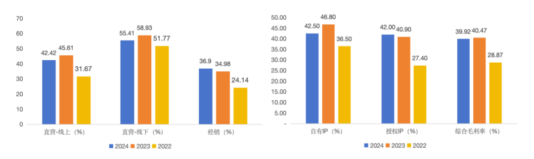 就毛利率而言,招股书显示,2022、2023、乐自天成在2024年的毛利分别为28.9%、40.5%、39.9%。即使在其毛利率较高的直销渠道和自有IP商品销售中,其毛利率也远低于布鲁可和泡泡玛特。考虑到这些公司的产品制造主要依靠国外合作生产,可以推断,乐自天成毛利率低的主要原因是营收规模不足,产品种类繁多,难以形成规模效应。