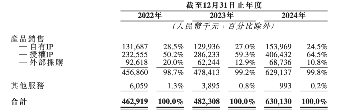 据招股书报道,乐自天成2022-2024年的总收入从4.63亿元增长到6.3亿元,复合增长率约为16%。其中,自有IP收入从1.32亿元增长到1.54亿元,复合增长率约为8%;授权IP的收益从2.33亿元增长到4.06亿元,复合增长率约为32%,授权IP的增长率和收入比例明显高于自有IP。