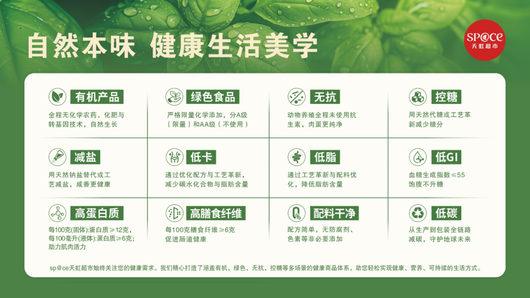 5月份,sp@ce天虹超市以《中国居民膳食指南》为原型,构建了12种健康标签体系,科学覆盖了“清洁、有机、无抗性、低GI”的调味品。、在12大层面上,如低卡,上架超过1200种明确的健康标识产品。