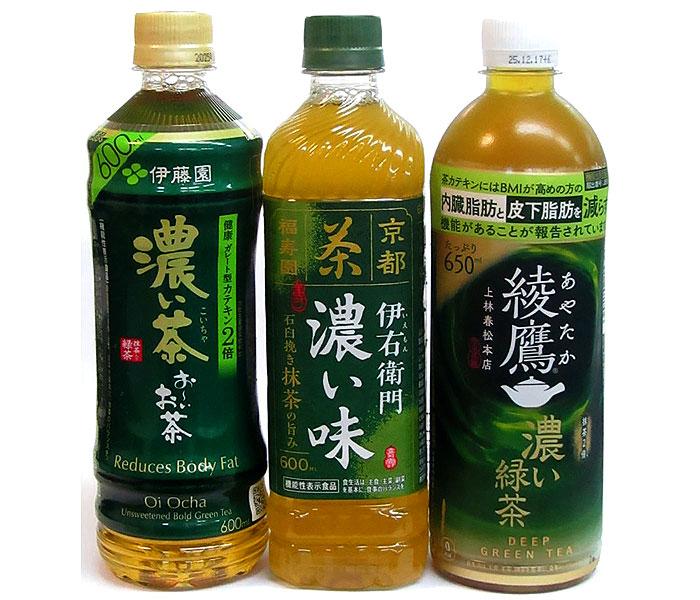 这些深色包装的茶饮料是目前日本顾客中流行的“浓茶”。它们的主要特点是使用的茶粉含量比普通商品高,或者茶汤中含有的儿茶素浓度更高(多酚之一是茶叶涩味的来源之一)。其中,浓绿茶是最重要的类型。