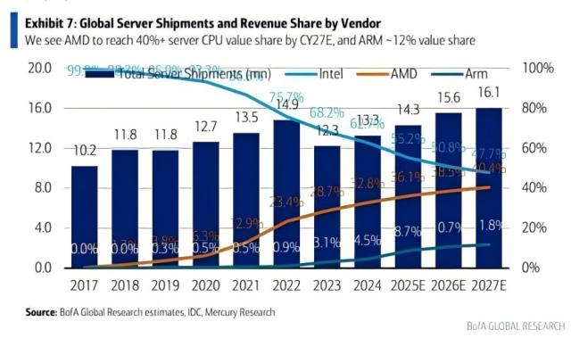 接着,一些分析师进行了总结 IDC 和 Mercury Research 调查数据显示,2024 年度英特尔在服务器处理器市场的份额已经下降到 63% 下面,具体是 62.7%;同期 AMD 拥有 32.8% 服务器 CPU 市场份额,而且这些数据还在持续增长。预计到 2025 年末,AMD 市场份额将进一步上升到市场份额 36%的英特尔份额下降到约36%。 55%;展望至 2027 年,AMD 有可能达到市场份额 英特尔预计将跌破40% 50% 关键节点,同时,ARM Cpu市场份额可能稳步上升至稳步上升 10% - 12%;到 2028 年,AMD 与英特尔的市场份额或呈现相当大的趋势。