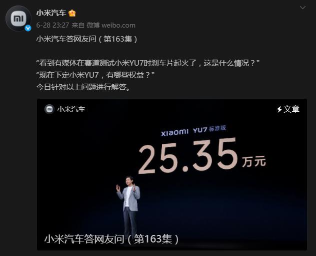 不过,这次刹车片起火事件无疑给了小米。 YU7 它带来了一些信任测试。然而,从小米汽车的回复来看,他们乐观地面对问题,详细解释原因,并给出专业建议,这可能有助于缓解客户的担忧。