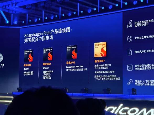 Snapdragon Ride 平台至尊版(骁龙) 8797)自 2024 2000年推出后,客户已经用于正在建设中的车型项目——例如,零跑汽车 D 该系列将配备双骁龙 8797 平台。骁龙 8797 正支持结合 / 通过使用视觉,中央计算平台投入部署和应用。 - 语言 - 动作模型(VLA)端到端部署,实现自然高速和城市驾驶;并通过由端到端部署 AI 功能性显示屏,提供更加沉浸式的驾驶舱系统。