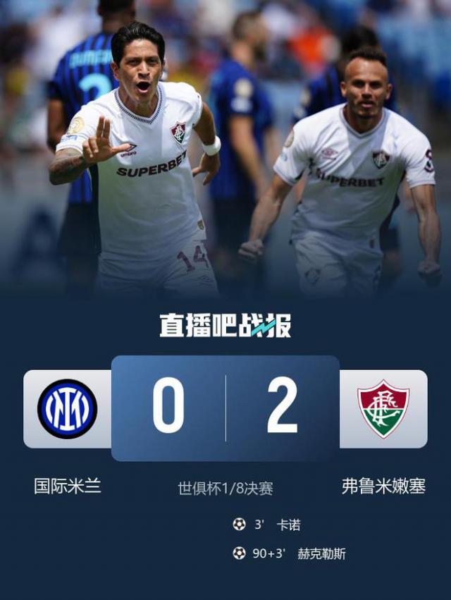 直播吧 7 月 1 日讯 直播吧 7 月 1 日讯 世俱杯 1/8 在决赛中,国际米兰与弗鲁米嫩塞进行了比赛,比赛在夏洛特美国银行体育场举行。上半场,卡诺闪击破门,伊纳西奥的进球被吹。易边再战,索默神扑救,德弗里错过机会,劳塔罗,迪马尔科中框,补时赫克勒斯再次进入下一个城市。最后国米 0-2 停止了弗鲁米嫩塞 16 强大,弗鲁米嫩塞将对阵曼城。 / 新月之间的胜利者。