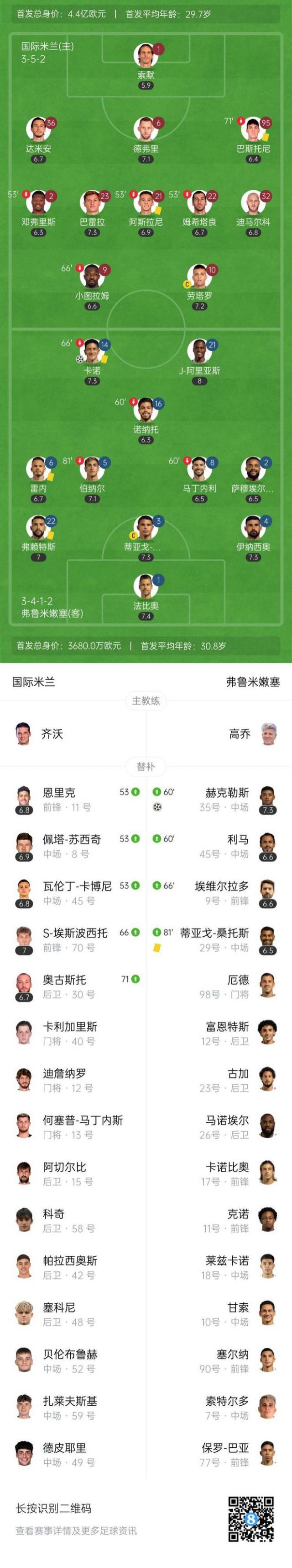 后半场补时 7 几分钟。最终结束了比赛,国际米兰。 0-2 弗鲁米嫩塞。