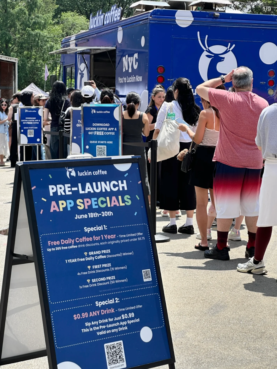 为了预热开业,瑞幸美国团队最近在纽约联合广场、SOHO区等拥挤的商业区进行了闪光汽车(Pop-up Truck)推广活动。活动推出了“一年免费喝咖啡”等重磅优惠,吸引了大量当地客户排队参与,相关场景在社交平台上引起了网友的关注。