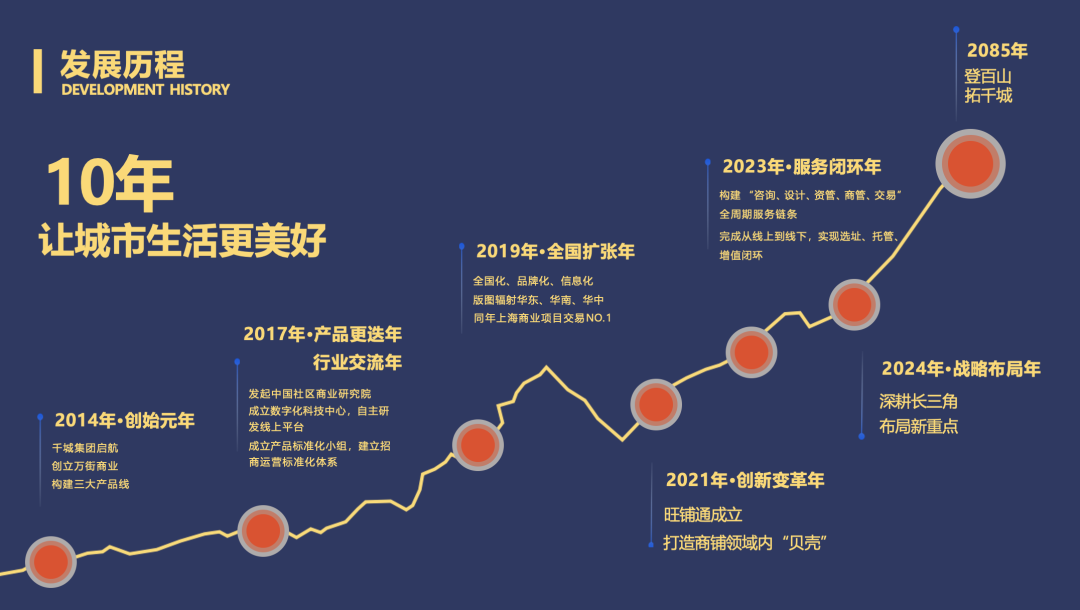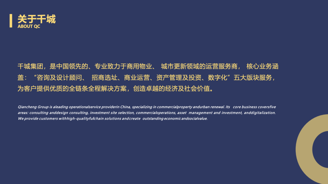 千城集团邀请各级政府、城市投资平台、开发企业共同探索历史街区振兴、股票商业复兴、文化旅游目的地升级的多元化路径。我们愿意使用“幸汇城隍/LUCKY HUB】以整合规划建设、招商运营、资本运营全链条服务能力为原型,帮助中国城市撰写文化自信与商业繁荣共存的新篇章。千城集团是中国领先的商业物业和城市发展运营服务提供商。其核心业务涵盖咨询设计、投资选址、商业运营、资产管理、数字化五大板块,管理面积超过160万。㎡,151个服务项目。