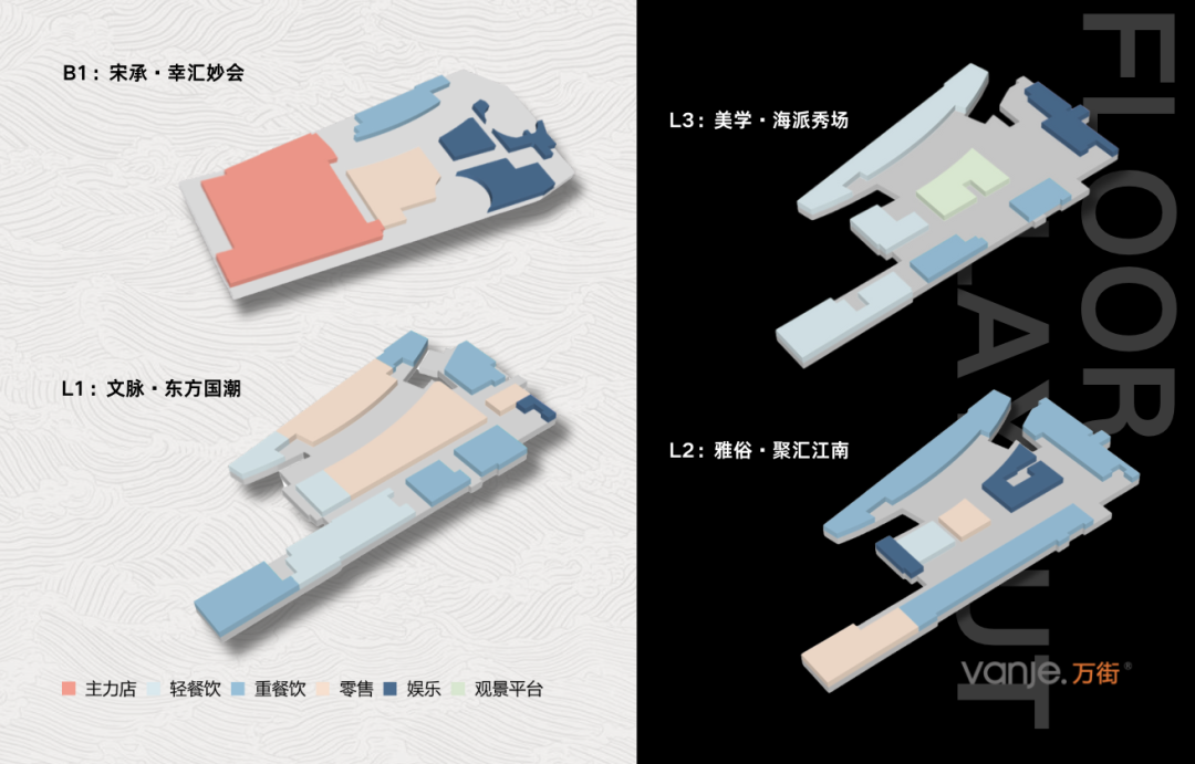 业态布局包括“宋承幸汇妙会、文脉东方民族潮流、雅俗聚会江南、美学海派秀”,并打造“魔都财神人间服务办公室”、“朋克梯子”等热门旅游打卡点。在不同的楼层和地区。
