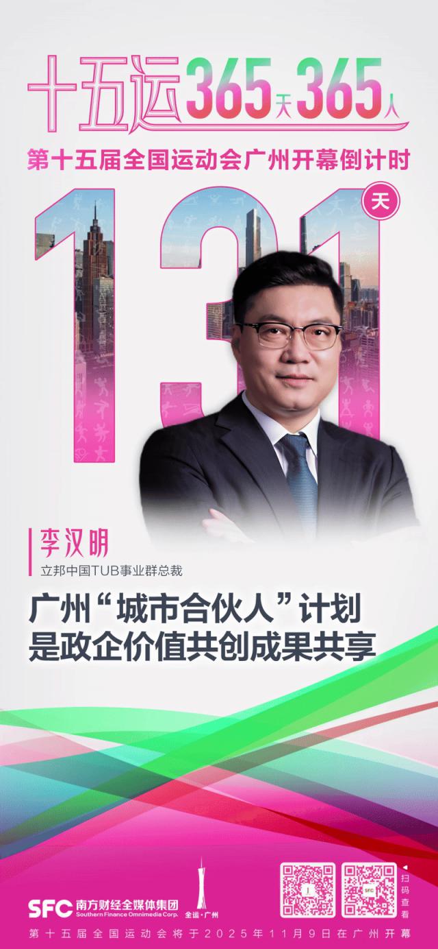 第十五届全国运动会将在 2025 年 11 月份在粤港澳三地举行。它是一项体育赛事,也是促进全民健身、促进体育事业高质量发展的重要机遇。在十五运会开幕倒计时一周年之际,南方财经全媒体集团与十五运会、残特奥会广州赛区执委会推出“十五运会” 365 天 365 “人”栏目聚焦选手、企业家、专家学者、体育爱好者、公众的全运故事和全运期待,让更多人了解和支持十五运,生动展现中国的体育精神、城市活力和文化魅力。