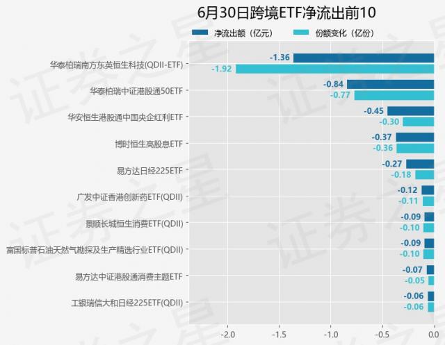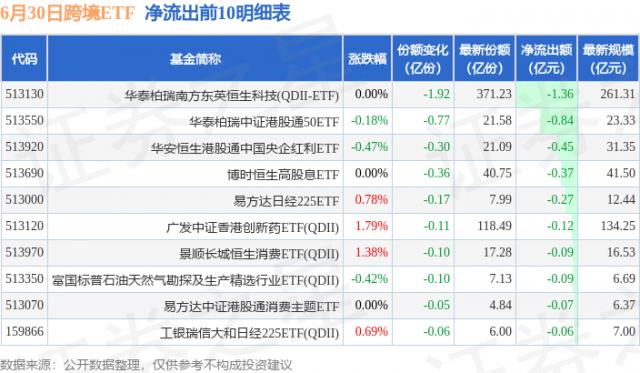 当天有 18 只跨境 ETF 资金净流出,其中华泰柏瑞南方东英恒生科技排名第一。 ( QDII-ETF ) (513130),份额下降 1.92 一亿份,净流出额为 1.36 亿元。
