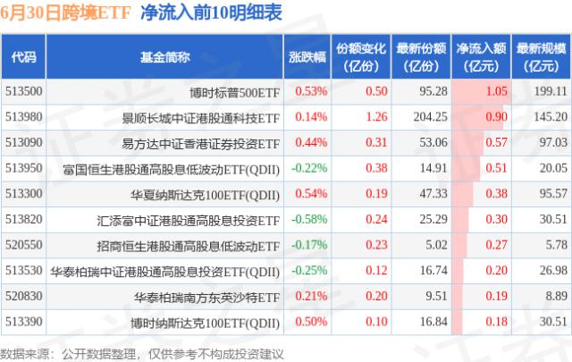 证券之星消息,6 月 30 日跨境 ETF 总资金净流入基金 1.35 亿元,近 5 一个交易日累计净流入 56.84 亿元,5 在一个交易日内,出现了日合计资金净流入。 4 天(ETF 计算资金流入的方法:(当日 ETF 现场流通份额 - 前一交易日 ETF 现场流通份额)* 当天 ETF 均价,数字仅供参考)。