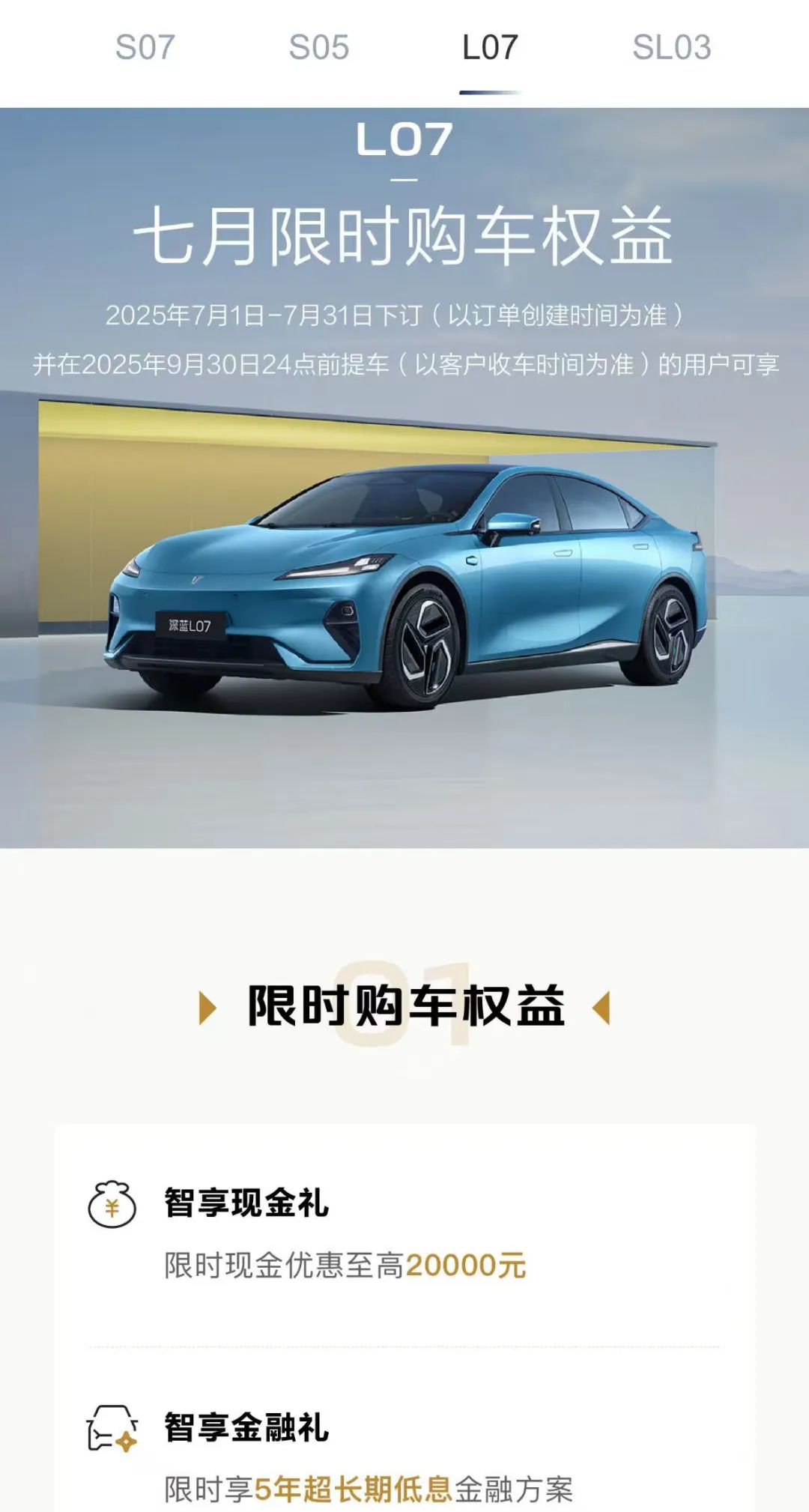 随后,深蓝汽车也宣布将于7月1日实施新的购车政策,有效期为7月31日。政策调整以“现金暴跌”为基础。 置换补贴 以金融贴息为核心。举例来说,深蓝L07车型和S07车型各自可享受20,000元、25,000元现金折扣,两款车型均提供5000元置换补贴,并配套5年低息金融计划。另外,买车的顾客还可以享受终身三电质保,3999元的充电桩(包括安装)和5000元的华为乾智驾ADS。 升值权益,如SE高级包服务。