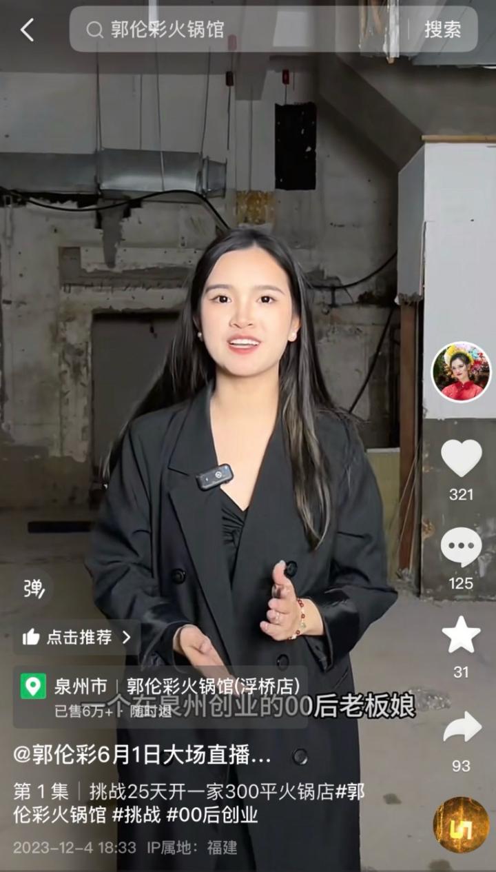 郭伦彩是00后四川农村女孩的典型代表。经过牛排店、美容院、电玩城、鞋厂,她和合伙人一起创办了一家火锅店,决定从创业之初就全身心地投入到Tiktok的推广中,用自己的农村女孩在大城市努力工作的亲身经历,记录火锅店从无到有的全过程。