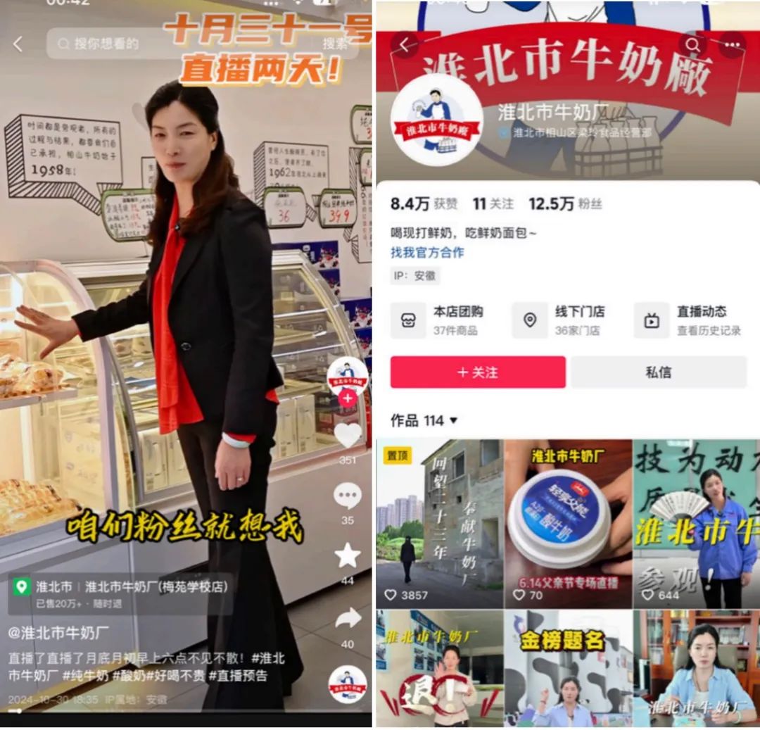 在王瑾的直播间里,消费者可以看到奶牛吃草、工厂挤奶、店里做面包等生活画面。后来她干脆用方言直播,成功唤醒了淮北人的童年记忆。到2024年底,淮北牛奶厂的抖音主账号已经积累了6万多粉丝,抖音团购月核销额可达250万。