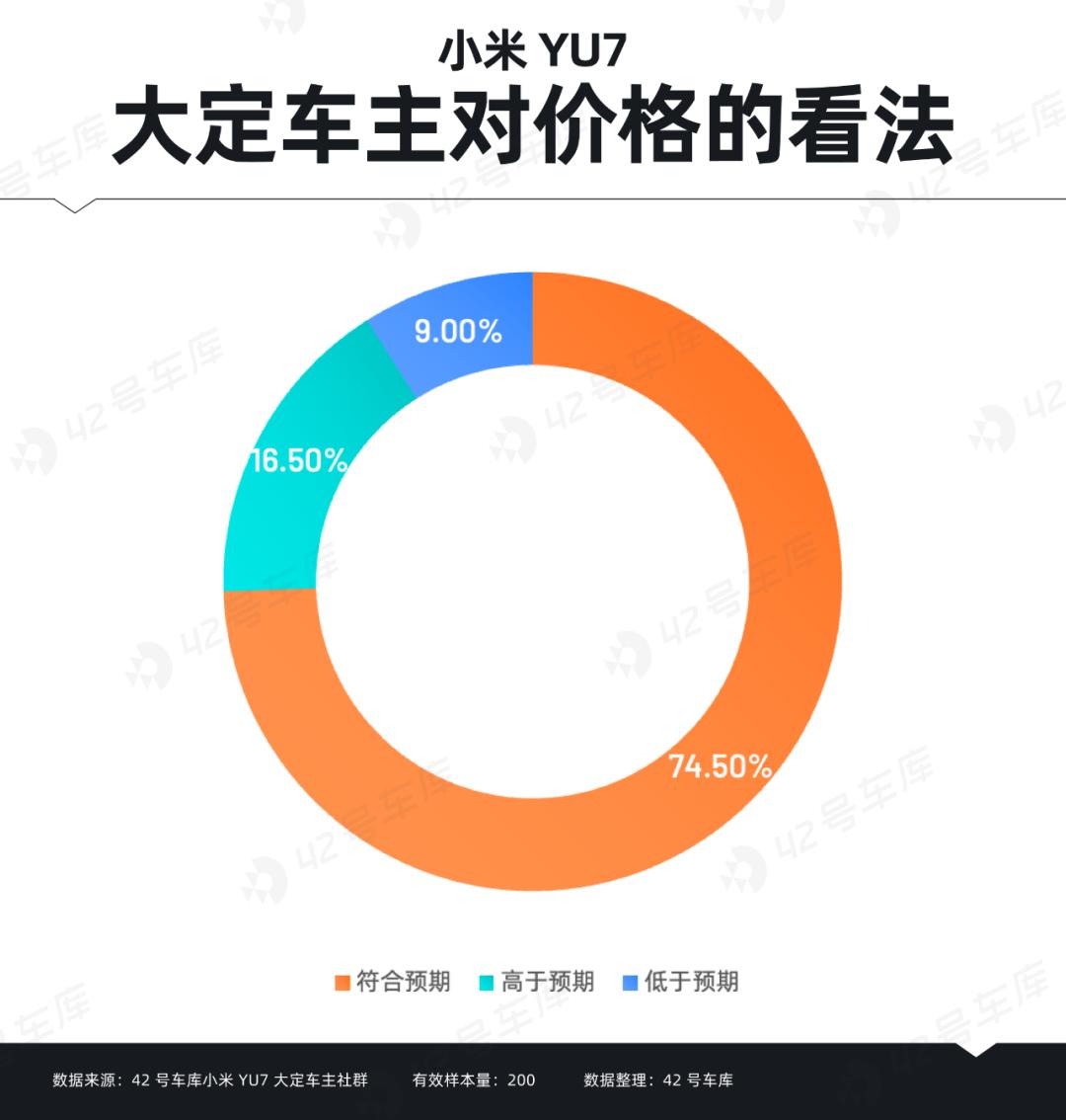 受访者被问及「小米 YU7 定价是否符合预期」时,74.5% 大定用户表示符合预期,16.5% 大定用户表示高于预期,以及 9% 大定客户表示小米 YU7 价格低于预期。
