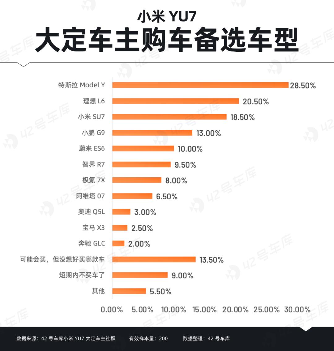 在被问到「假如市场上没有小米 YU7 会买什么车」在这个时候,最多的顾客会选择特斯拉 Model Y 比例是作为替代品 28.5%;其次是理想 L6,比例为 20.5%。这样不仅反映了特斯拉 Model Y 标杆地位,也说明小米 YU7 有些用户群体有一些家庭用车的需求。