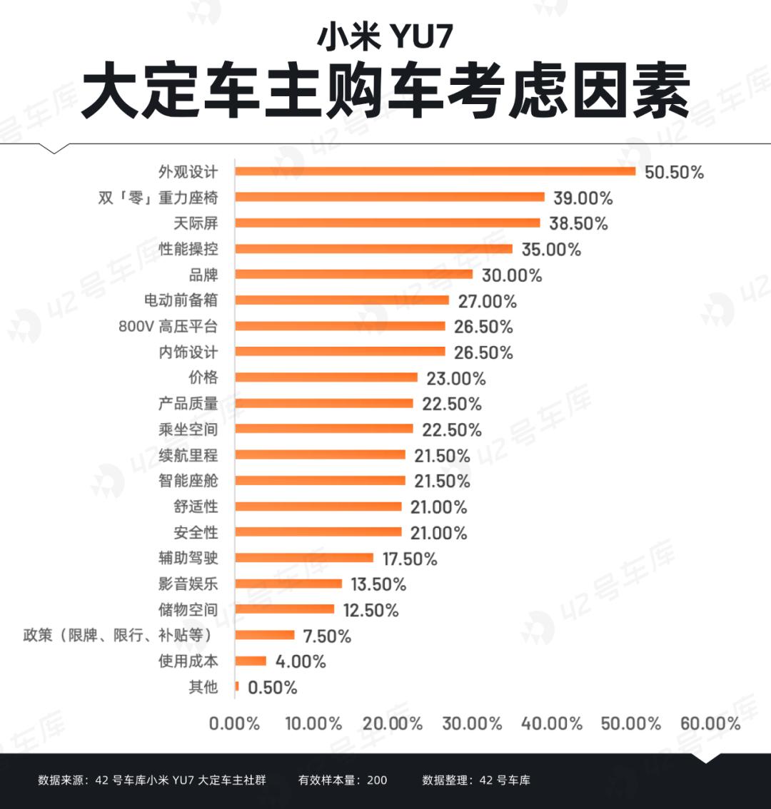 「外观设计」、「双零重力座椅」和「长空屏」正是受访者在购买小米。 YU7 时间主要参考标准。「性能操控」和「品牌」跟在后面,而且「辅助驾驶」和「影音娱乐」被提及的次数较少。