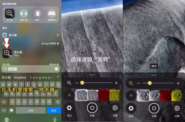 具体的操作步骤是,iOS 12 对于上述系统用户,可以通过下拉主屏幕进行搜索,进入“放大器”应用。点击底部的“滤镜”图标,选择“翻转”,然后拍摄宠物毛发。有虫子的地方会很亮。