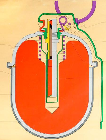 M/54 手榴弹分解视图。内部压制蛋形 TNT 炸药。用于安装引信的两个弹壳、厚实淬火钢制成的内破片衬层、薄机壳和管座都清楚可见。