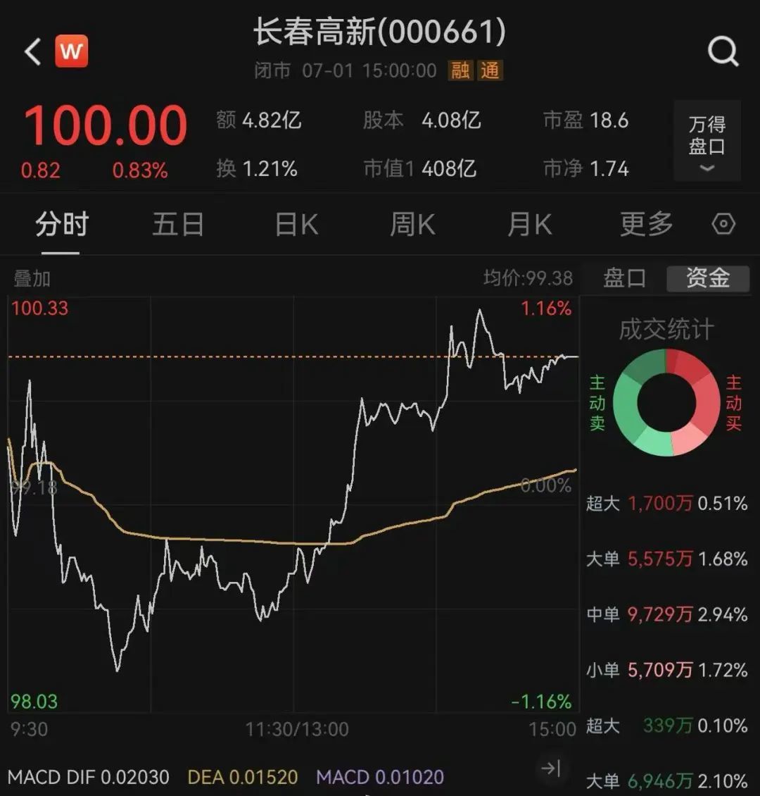 七月一日,长春高新股收盘100元/股,上涨0.83%,最新市值408亿元。