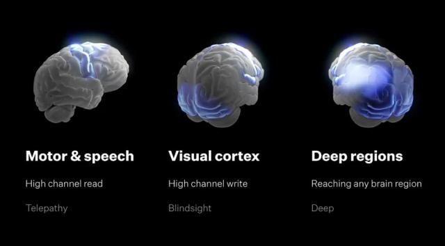 为实现全脑交互系统,Neuralink 三大产品体系正在突破:包括运动与语言、视觉皮层、深层区域三个方面: