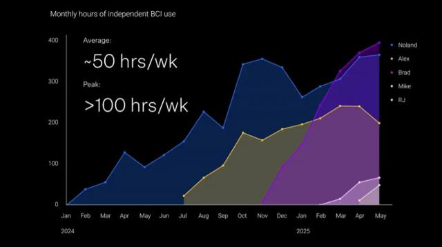 Neuralink 数据显示,在过去一年半的时间里,前五名受试者平均每周使用脑机接口的时间约为 50 每周高峰使用时间超过一小时, 100 小时。