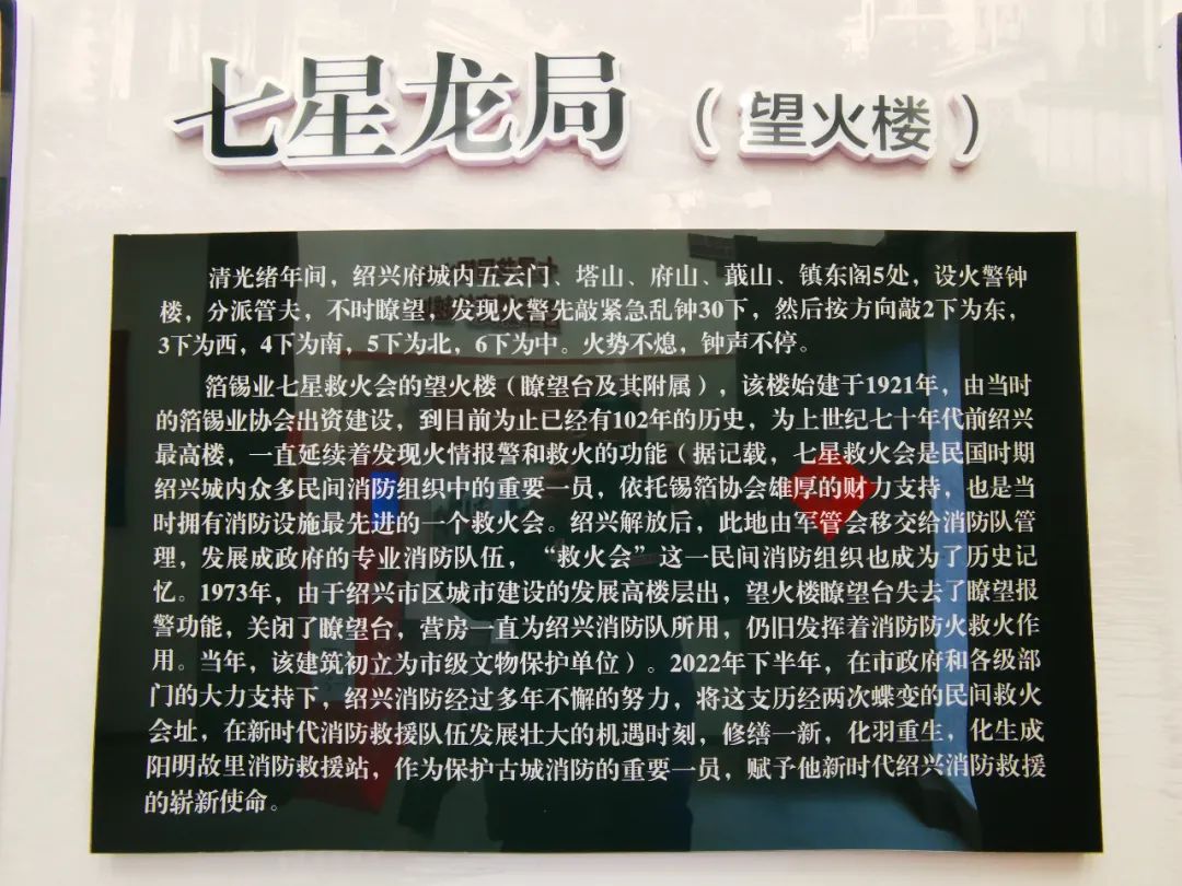 1973年,随着绍兴城市建设的发展,“七星龙局”关闭了望台,从此失去了预警功能。此后,这座建筑被列为市级文物古迹,这座百年建筑得到了保护。2022年下半年,在市委、市政府及相关部门的大力支持下,对这座经历了两次蜕变的民间灭火会址进行了修缮和再生,建成了阳明故里的消防救援站,让这座曾经的消防楼恢复了百年前的功能。