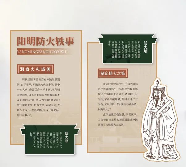 灾后重建时,王阳明果断实施新规定:要求沿街居民放弃拓宽道路空间,房屋之间必须留有防火巷,并筹集资金建造墙壁和防火雨。这个系统规划消防通道的方法体现了这位先辈的务实智慧。他“知行合一”的核心思想,与一楼展区七星龙局引进先进设备、建立预警网络的实际做法不谋而合,共同展示了守护家园安全的智慧。