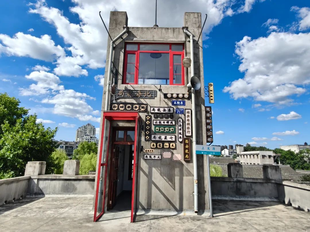 上升时,上大路过去的市场烟火在这里流淌,锡箔的银光,钱庄的票影,五金的铁色,交织成日夜守护望火楼的繁华景象。三层露台,“北海龙局”、像“诚昌锡箔庄”这样的老字号招牌和龙局旗帜,仿佛时间的碎片,瞬间将人们带到民国街头的喧嚣。
