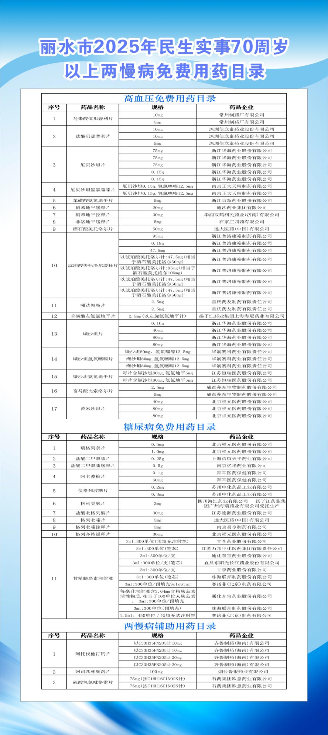为“两慢病”提供免费药物。符合条件的患者可根据身体状况自愿选择免费药物,详细《丽水市2025年民生实事70岁以上“两慢病”免费用药目录》;